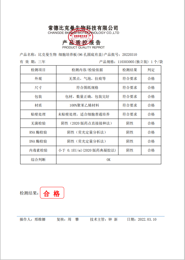 比克曼生物 細(xì)胞培養(yǎng)板(96孔圓底有蓋)(獨(dú)立裝) 1個培裝 110303005 20220310