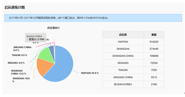 4.啟運(yùn)港和目的港統(tǒng)計(jì)圖,同樣是清晰展示出采購商在2019年交易記錄中,港口的信息情況。那么其中起運(yùn)港也就是裝貨港 = 預(yù)測貨物的產(chǎn)地、產(chǎn)品質(zhì)量、具體的材質(zhì)、競爭對手分布情況
