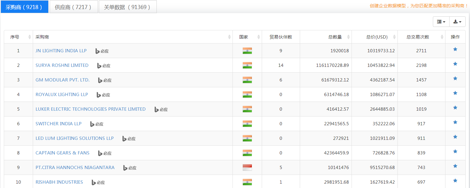 三:這個(gè)時(shí)候我們可以看到所有采購商的名稱以及基本情況,那么下面用序號2的SURYA ROSHNI LIMITED這個(gè)采購商舉例,直接點(diǎn)擊公司名稱進(jìn)入這個(gè)采購商查驗(yàn)報(bào)告頁面,也就是這個(gè)公司的的詳細(xì)分析頁面。