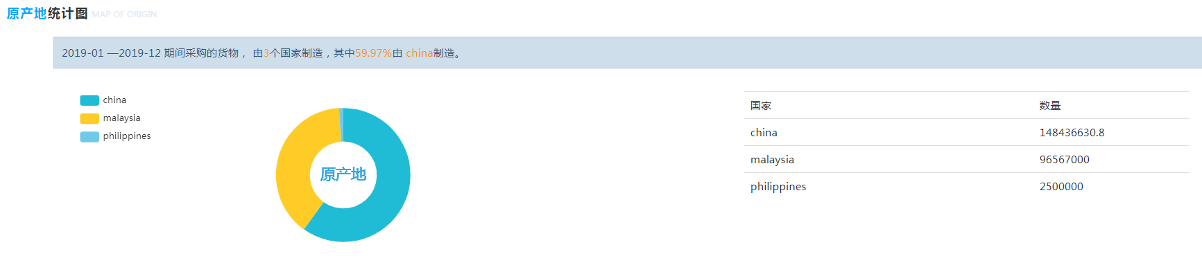 3.原產(chǎn)地統(tǒng)計(jì)圖:在這個(gè)位置可以清晰看到RAB LIGHTING公司在2017全年采購LED LIGHT交易中,主要原產(chǎn)地是China,中國制造。而原產(chǎn)國統(tǒng)計(jì)圖可以幫助你掌握所有原產(chǎn)國出口的重量、次數(shù)、供應(yīng)的商品的匯總。分析所有原產(chǎn)國所占據(jù)出口市場的百分比等。了解全球出口量最大的原產(chǎn)地到最小的原產(chǎn)地,分析產(chǎn)品在全球的競爭情況或變化情況。
