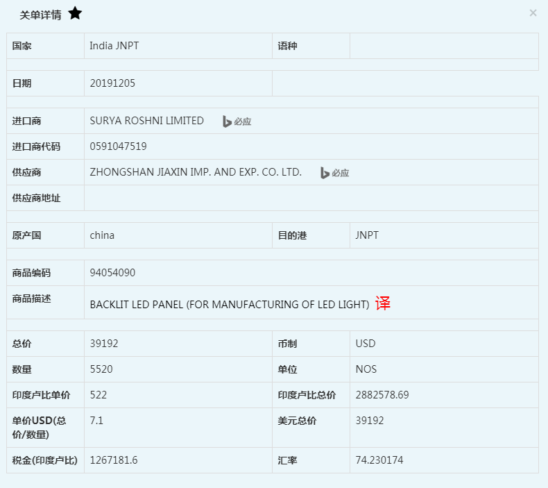 如下圖,就是此印度采購商數(shù)據(jù)中的一票交易信息,其中我們公司應(yīng)用了必應(yīng)等搜索引擎,可以便于客戶利用搜索引擎直接在線查詢采購商更多的信息。還有翻譯軟件,點(diǎn)擊紅色的“譯”字,直接在線翻譯。