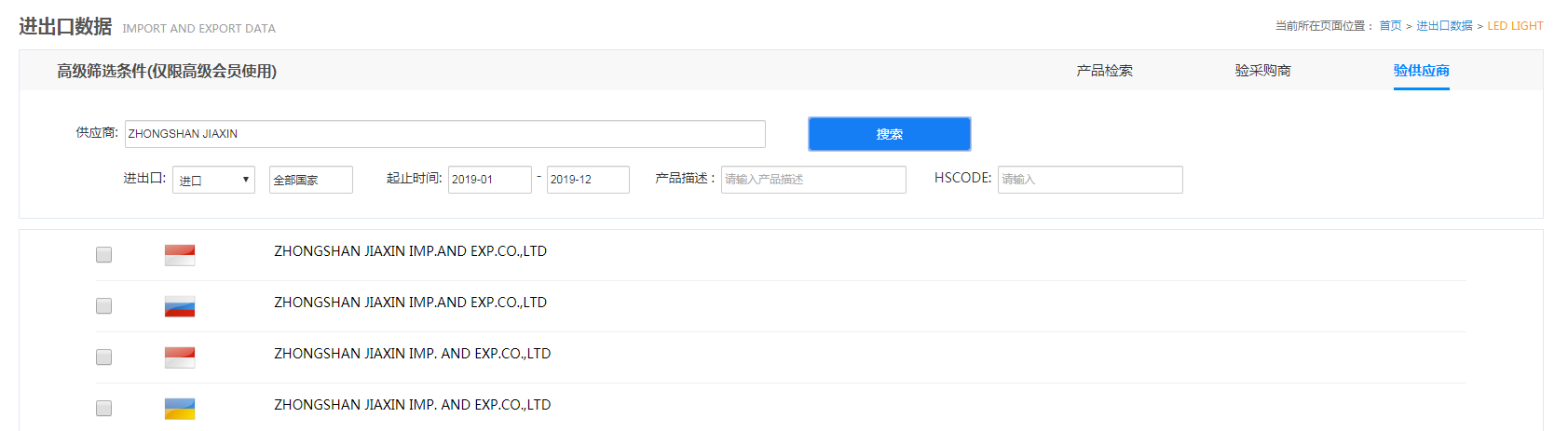 一:海關(guān)數(shù)據(jù)搜索入口是頁面最上面的搜索框,選擇進(jìn)出口數(shù)據(jù),輸入產(chǎn)品信息,下面以搜索LED LIGHT舉例。下圖為搜索結(jié)果頁: