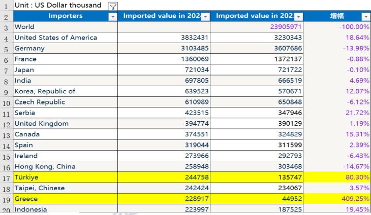 1. 通過(guò)整體數(shù)據(jù)看,歐盟包括澳洲發(fā)達(dá)國(guó)家的進(jìn)口是整體下降的,但歐洲有幾個(gè)國(guó)家的增幅非常亮眼,出現(xiàn)了幾倍的增長(zhǎng),包括希臘 409.2%,愛(ài)沙尼亞 117%,土耳其 80%。