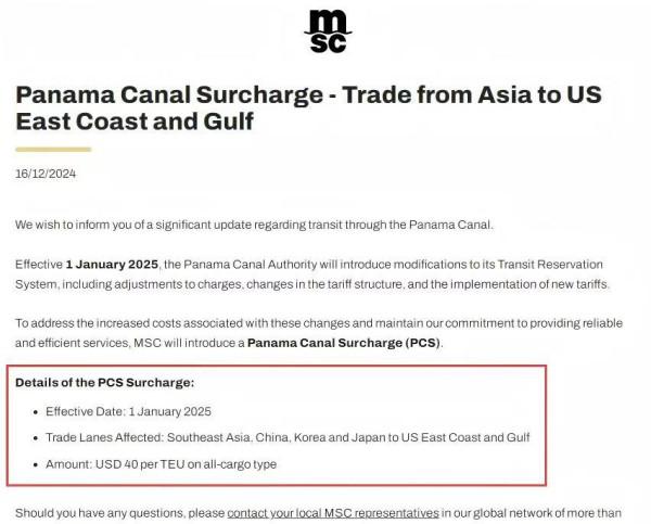 12 月 16 日,MSC 地中海海運發(fā)布公告告知客戶,為應對這些變化導致的成本上升,同時堅守提供可靠高效服務的承諾,將自 2025 年 1 月 1 日起引入巴拿馬運河附加費(PCS),針對東南亞、中國、韓國和日本至美國東海岸和墨西哥灣的受影響貿(mào)易航線,所有貨物類型均按 40 美元/TEU 收費。