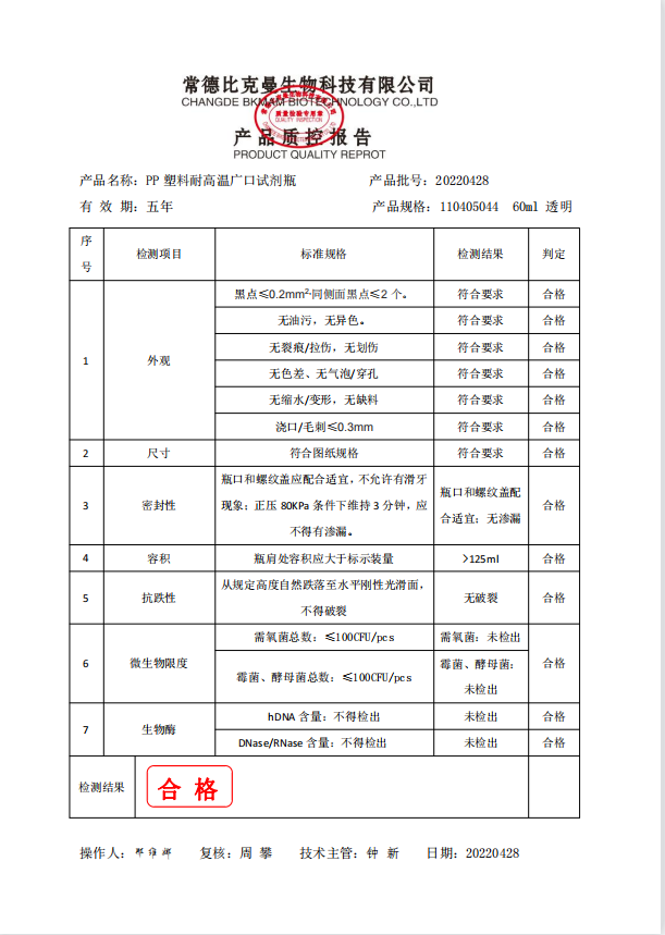 比克曼生物 PP塑料耐高溫廣口試劑瓶 60ml 110405044 20220428