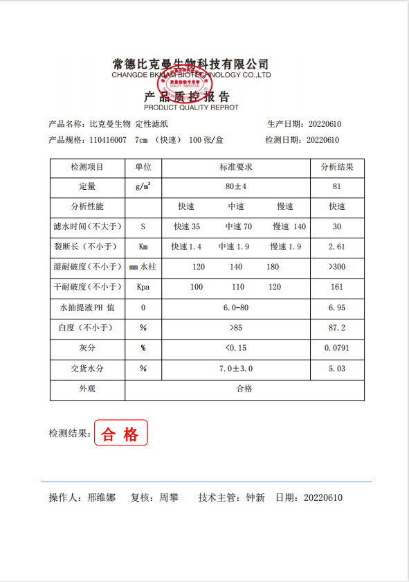 比克曼生物 定性濾紙 7cm(快速) 100張盒 110416007 20220610