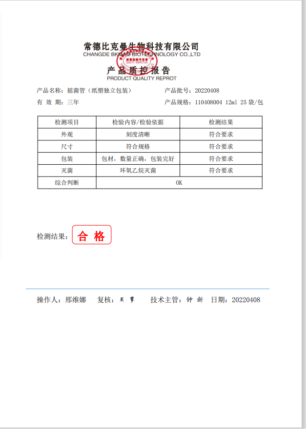 比克曼生物 搖菌管(12ml 紙塑獨(dú)立包裝)1個(gè)袋 25袋包 110408004 20220408