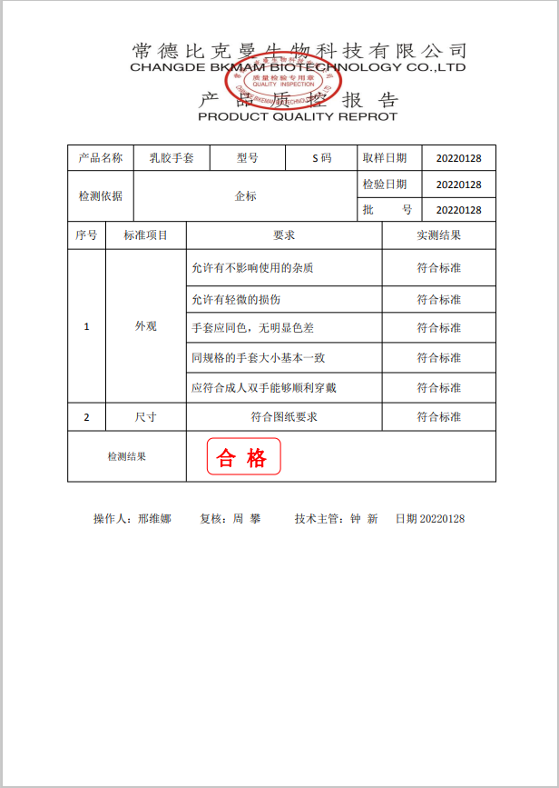 比克曼生物 乳膠手套 S碼 50雙盒 110601008 20220128001 質(zhì)檢報告