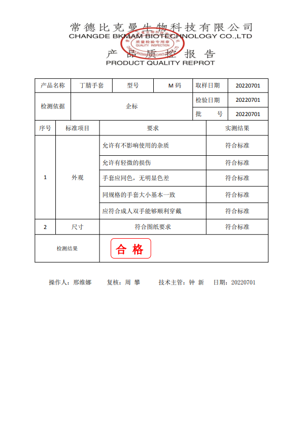 比克曼生物 丁腈手套 M碼 50雙盒 110601013 20220701 質(zhì)檢報(bào)告