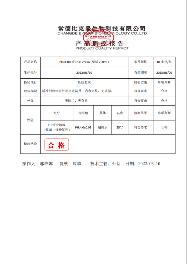 比克曼生物 PH緩沖劑 PH=4.00緩沖劑 250ml(配制250ml) 110702002 20220610
