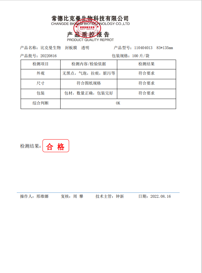 比克曼生物 封板膜 透明 83x135mm 100片袋 110404013 20220816