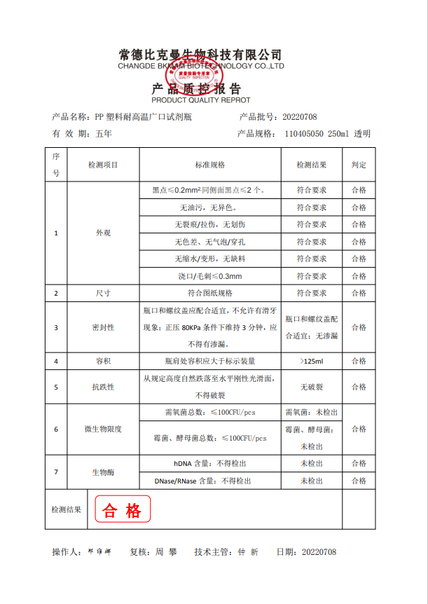 比克曼生物 PP塑料耐高溫廣口試劑瓶 250ml 透明 110405050 20220708