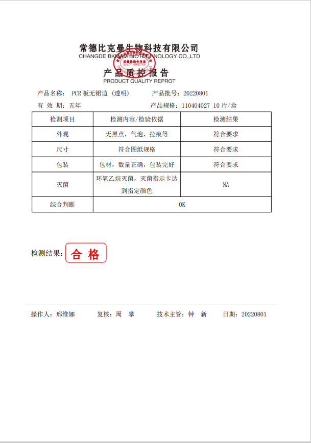 比克曼生物 PCR板無裙邊 (透明) 0.2ml 10片盒 110404027 20220801
