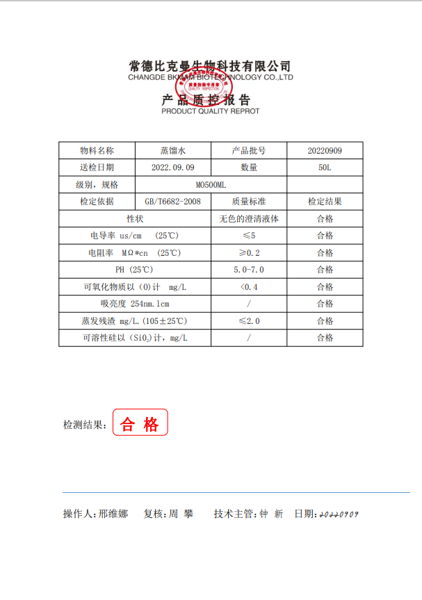 比克曼生物 蒸餾水 500ml 瓶 110702069 20220909