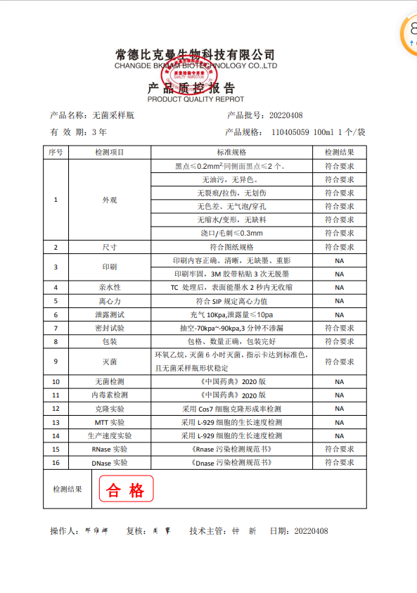 比克曼生物 無菌采樣瓶 100ml 獨立裝 110405059 20220408