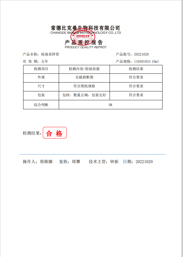比克曼生物 病毒采樣管(棉蓋,不擰蓋,非滅菌) 10ml 110401034 20221020