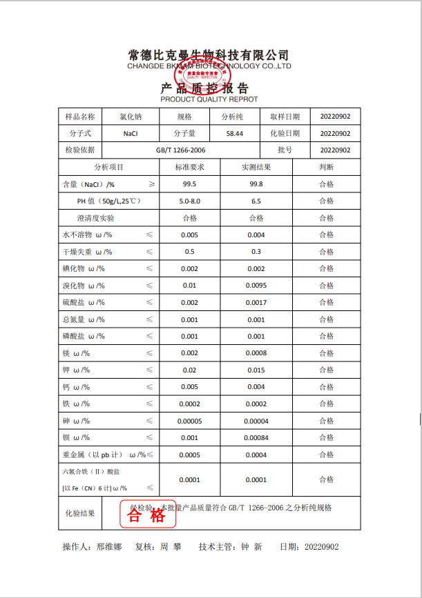 比克曼生物 氯化鈉 AR 分析純 500g瓶 110702034 20220902
