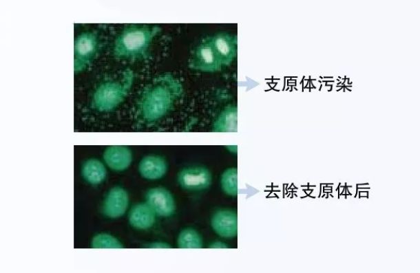 支原體是一類缺乏細(xì)胞壁呈高度多形性的原核細(xì)胞型微生物,大小為0.1~0.3微米,所以除菌濾器無(wú)法正常對(duì)支原體進(jìn)行濾除,是目前所知能在無(wú)生命培養(yǎng)基中生長(zhǎng)繁殖的最小的微生物。在細(xì)胞培養(yǎng)過(guò)程中,支原體感染發(fā)生率達(dá)到63%,當(dāng)細(xì)胞(特別是傳代細(xì)胞)被支原體污染后,細(xì)胞內(nèi)的DNA、RNA及蛋白表達(dá)發(fā)生改變,而細(xì)胞的生長(zhǎng)率一般并未發(fā)生顯著的影響,因而細(xì)胞被支原體污染一般難以察覺。