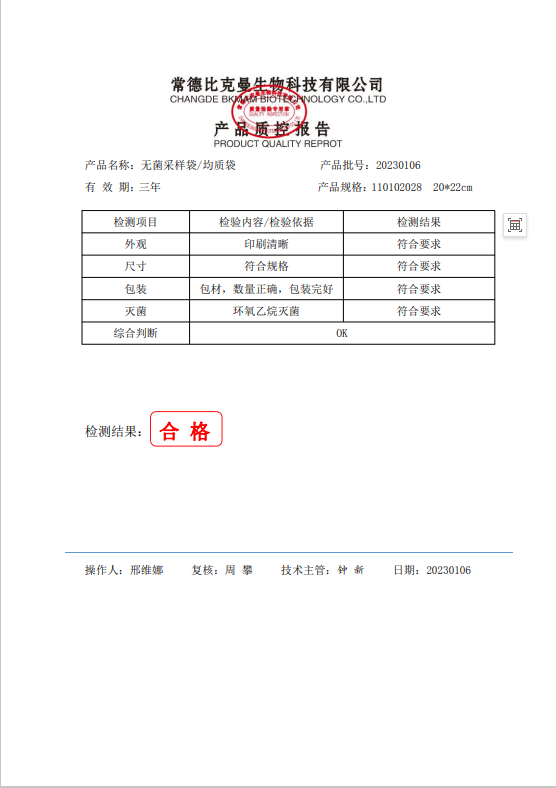 110102028 比克曼生物 立式無菌采樣袋 20x22(帶壓條) 100個裝 20230106