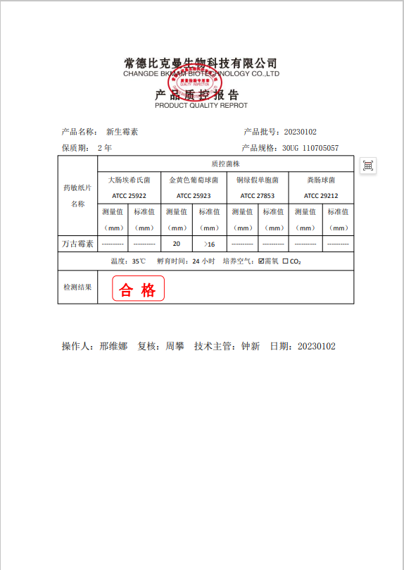 110705057 比克曼生物 新生霉素 30UG 20片瓶 20230102