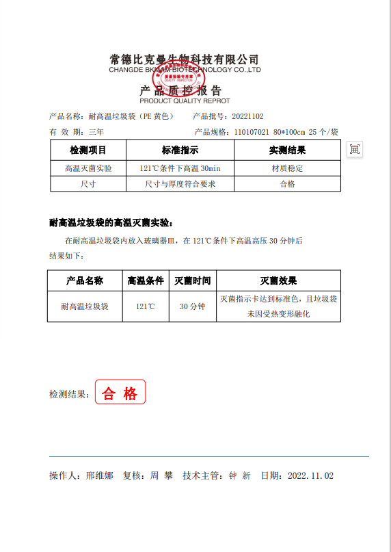 110107021 比克曼生物 耐高溫垃圾袋 黃色 80x100cm (PE復合膜材質) 25個袋 20221102
