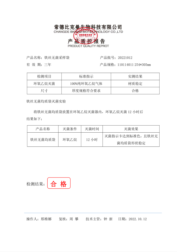 110114011 比克曼生物 鐵絲無菌采樣袋 254x305 (帶書寫區(qū)域) 50個裝 20221012