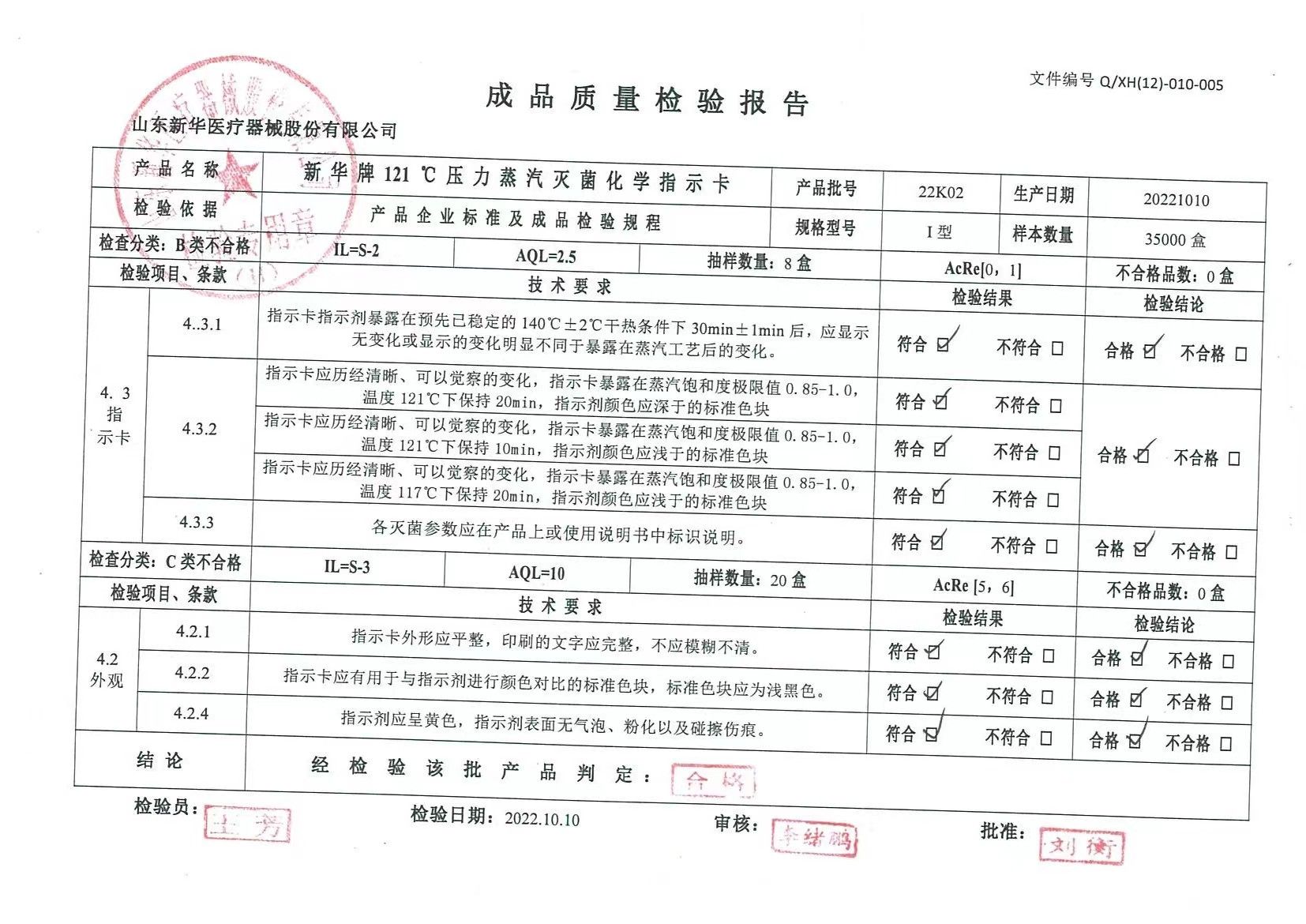 新華牌 121℃壓力蒸汽滅菌化學指示卡 I型 批號22K02 生產(chǎn)日期 20221010