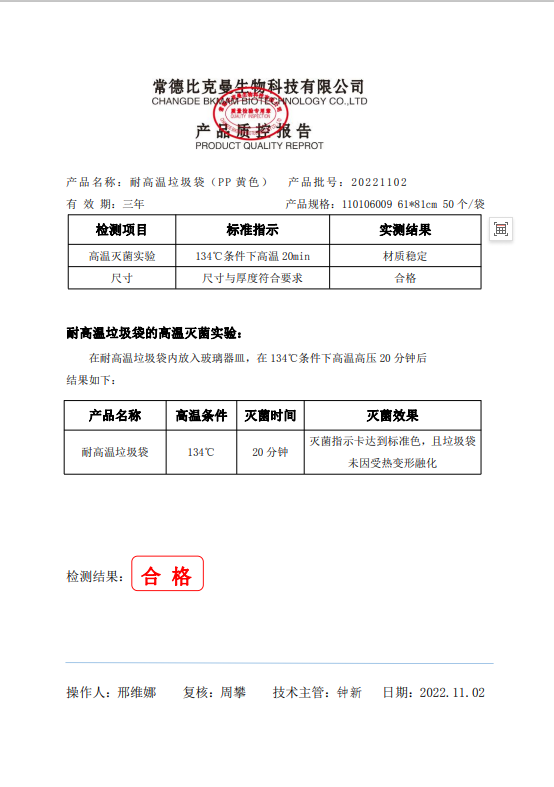110106009 比克曼生物 耐高溫垃圾袋 黃色 61x81cm (PP復合膜材質(zhì)) 50個袋 20221102