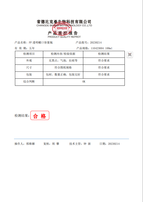 110423004 比克曼生物 PP透明螺口容量瓶 100ml 20230214