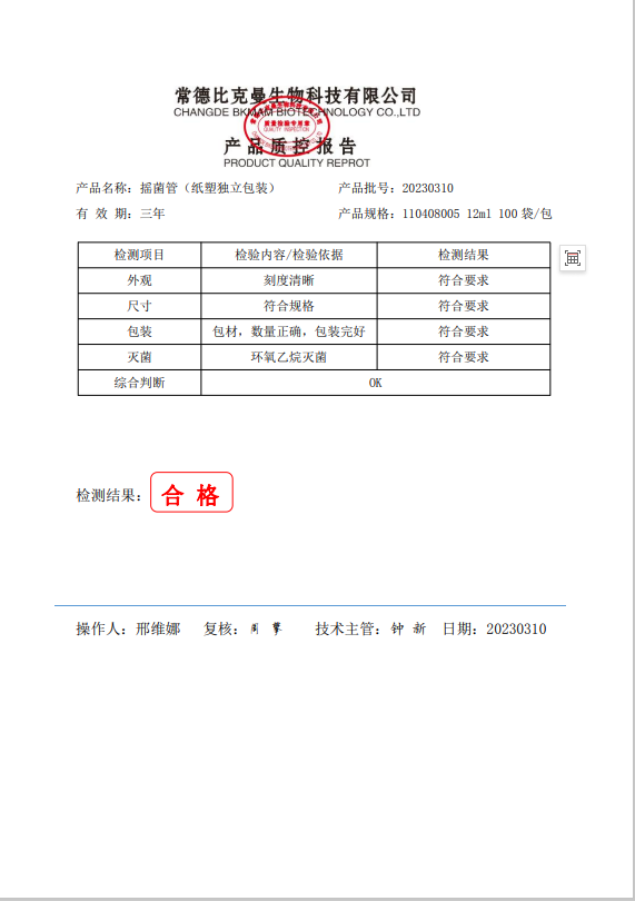 110408005 比克曼生物 搖菌管(12ml 紙塑獨(dú)立包裝)1個(gè)袋 100袋包 20230310