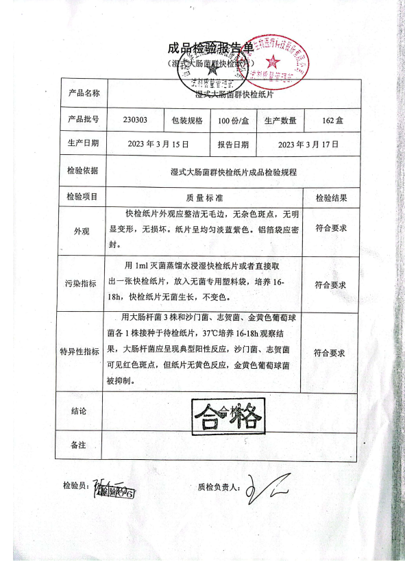 康華 濕式大腸菌群快檢紙片 100份盒 160711012 230303