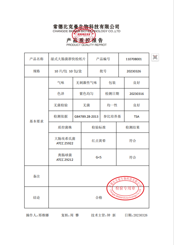 110708001 比克曼生物 濕式大腸菌群快檢紙片 100片盒 20230326