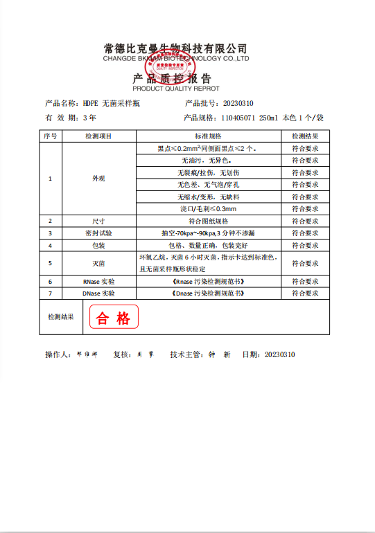 110405071 比克曼生物 HDPE 無菌采樣瓶 250ml 本色 獨(dú)立裝 20230310