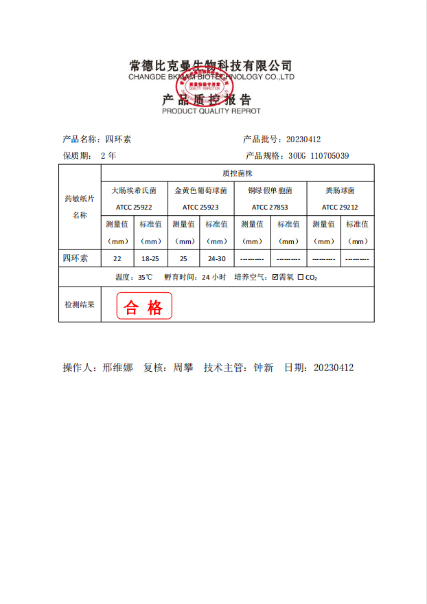 110705039 比克曼生物 四環(huán)素 30UG 20片瓶 20230412
