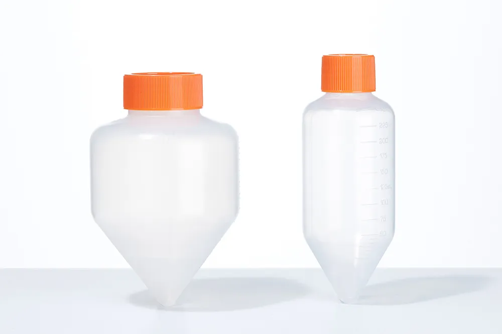 大體積樣本離心瓶 離心瓶用于大體積樣本的處理,瓶身側(cè)面有刻度凸起。離心瓶清潔后可重復(fù)使用。使用離心瓶是一定需要大型臺式離心機或立式離心機的。