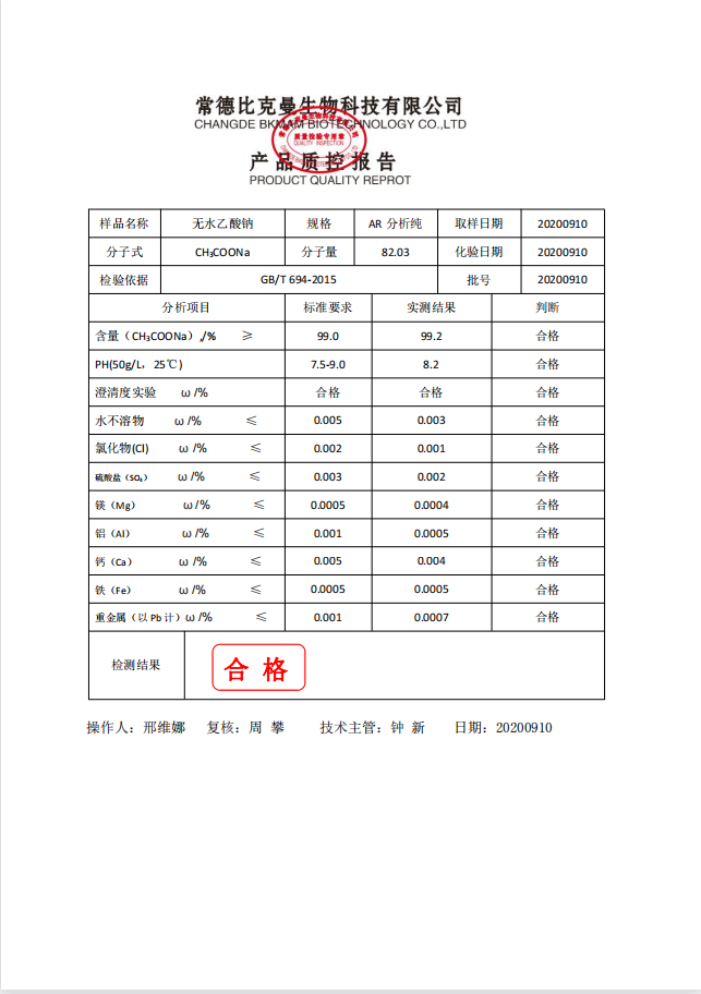 比克曼生物 無水乙酸鈉 AR分析純 250g瓶 110702057 20200910