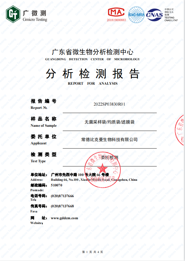 第三方報告 2022SP03830R01-無菌采樣袋&均質(zhì)袋&濾膜袋 20220408