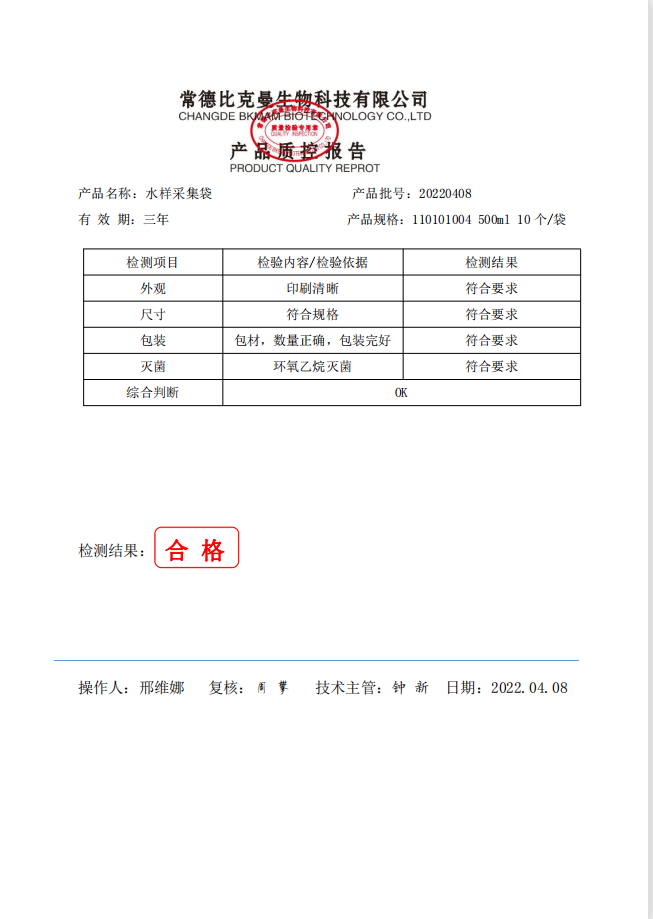 水樣采集袋 (含硫) 500ml 10個袋 110101004 20220408